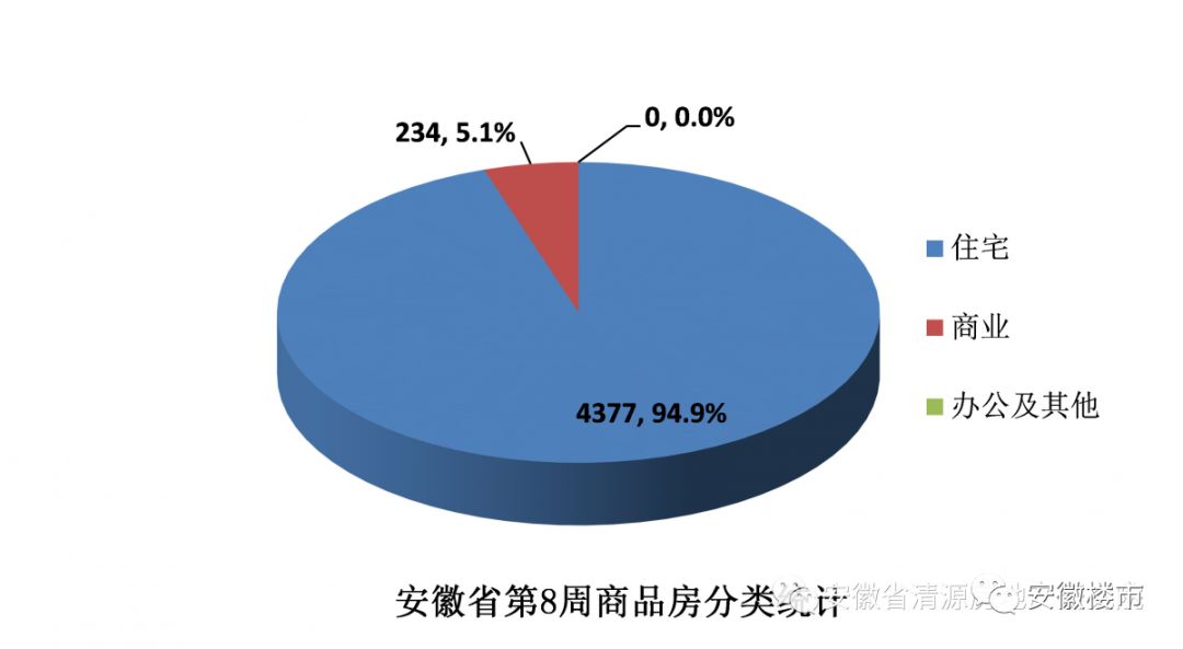 从成交结构来看,安徽省第8周住宅备案量为4377套,占比94.9%,商业备案量为234套,占比5.1%,办公及其他本周期间无备案。