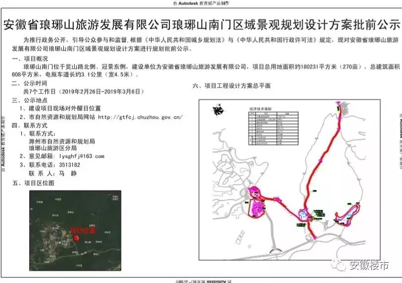 滁州市自然资源和规划局发布琅琊山南门区域景观规划设计方案批前公示,据悉琅琊山南门位于览山路北侧、冠景东侧建设单位为安徽省琅琊山旅游发展有限公司,项目总用地180231平方米,总建筑面积608平方。