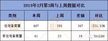 2019年2月第3周相比较上周,住宅销量增加347套,环比上涨231.33%;非住宅增加18套,环比上涨78.26%。