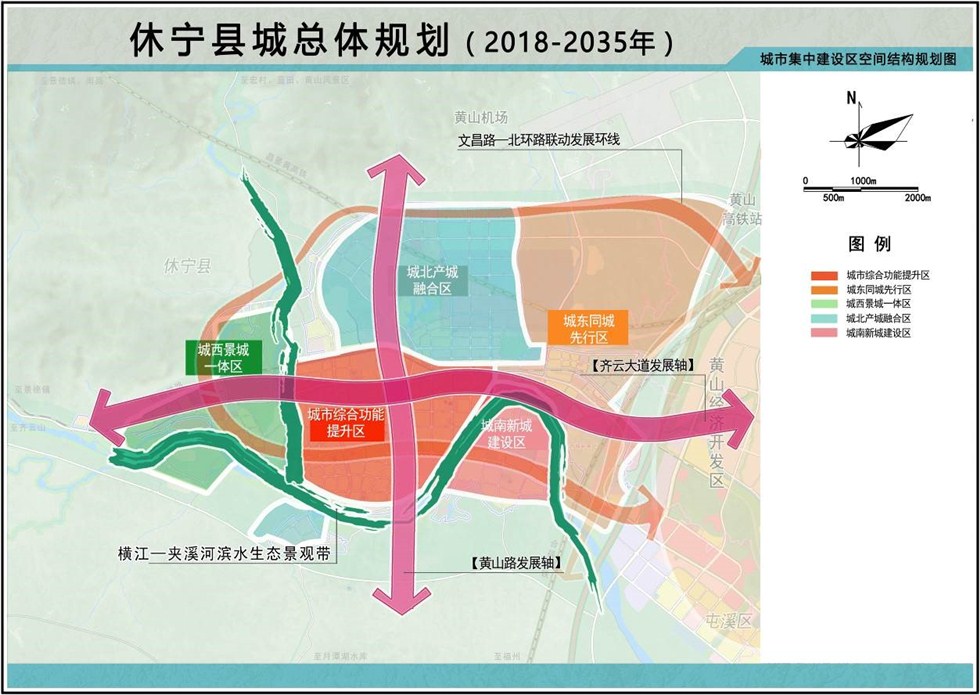 通过主干道齐云大道、文昌路和北环路向东与区域交通枢纽贯通,形成休宁城区与黄山中心城区相向发展、无缝对接屯休同城化发展大格局。
