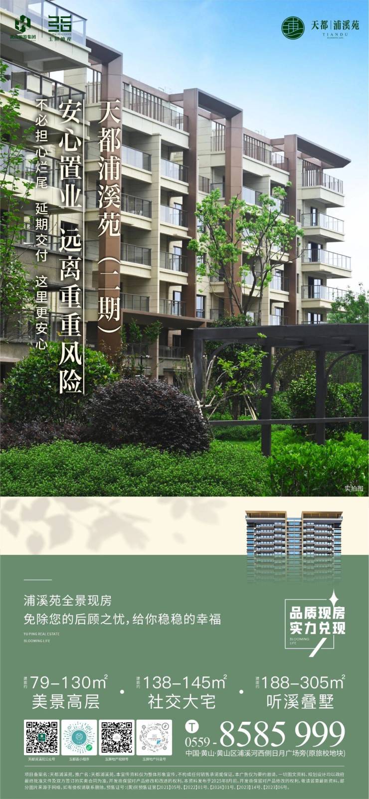 品质现房,实力兑现。天都浦溪苑建面约79 - 130㎡的美景高层,138 - 145㎡社交大宅,188 - 305㎡听溪叠墅,全户型国企实景现房热售中。