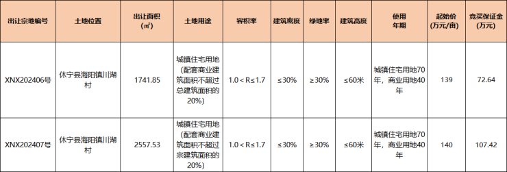 2024年7月24日,休宁县XNX202406号、XNX202407号地块挂牌,宗地位于休宁县海阳镇川湖村,土地性质为商住用地,配套商业建筑面积不超过总建筑面积的20%。