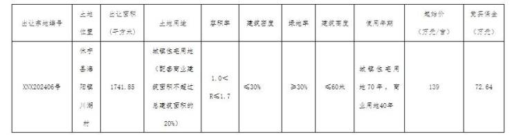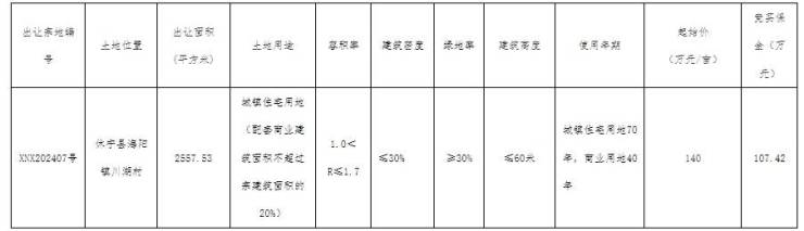 XNX202407号地块出让总面积2557.53㎡(合3.84亩),容积率1.0<R≤1.7,起始总价:537.08万元,起拍单价:2100元/平方米(140万元/亩),起拍楼面地价:1235.3元/㎡,拍卖时间:2024年8月26日15:30分。