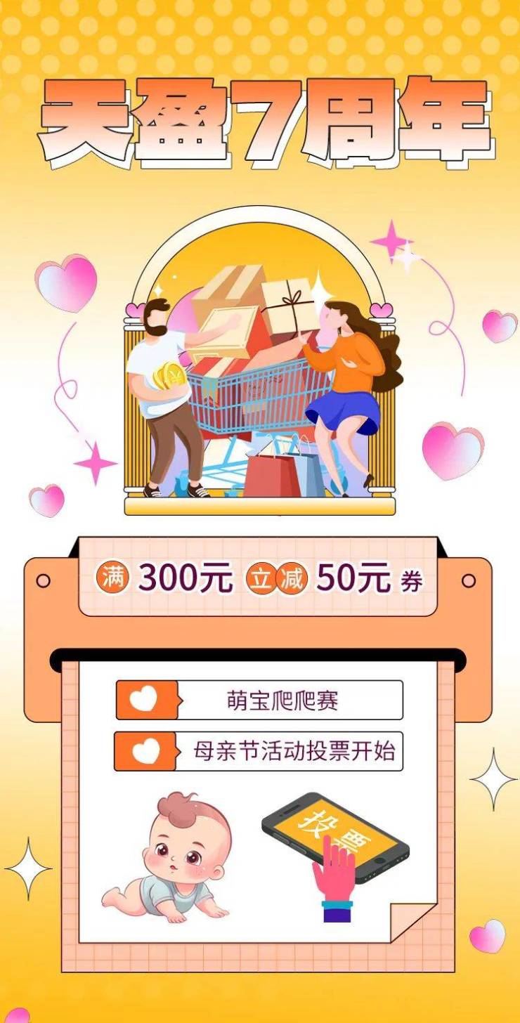 母亲节活动投票正式开始啦每周五满300立减50元券萌宝爬爬赛、满减券、奖品福利…母亲节活动第一名将获得天盈为你送出的天盈购物中心1楼中庭已经报名的宝爸宝妈们快把奖品带走~在公众号商城领取~(5月26日之前每周…