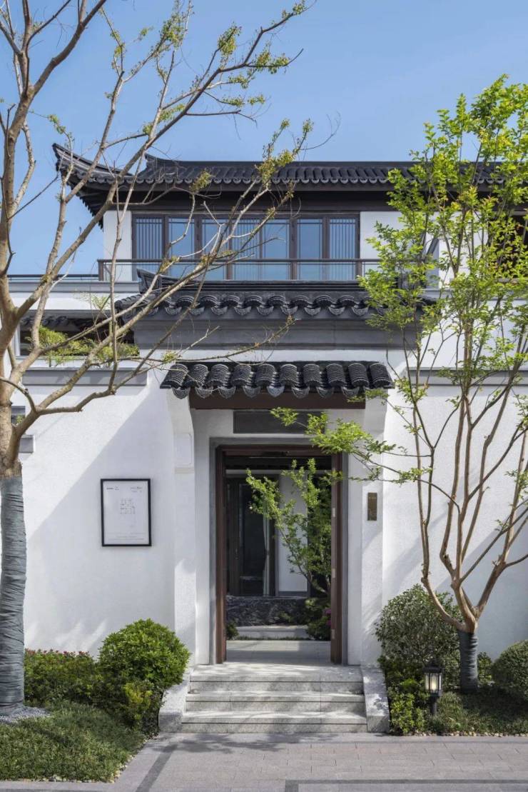 在浣云接待展厅和实景示范区提前领略的不止有中式美学的雅致,更有风雅落于方寸的精致。青黑色的瓦片,白色的砖墙,飞扬的屋檐,温热的阳光,还有旁逸斜出的枝芽,诗意的桃源在这里如云盛绽。