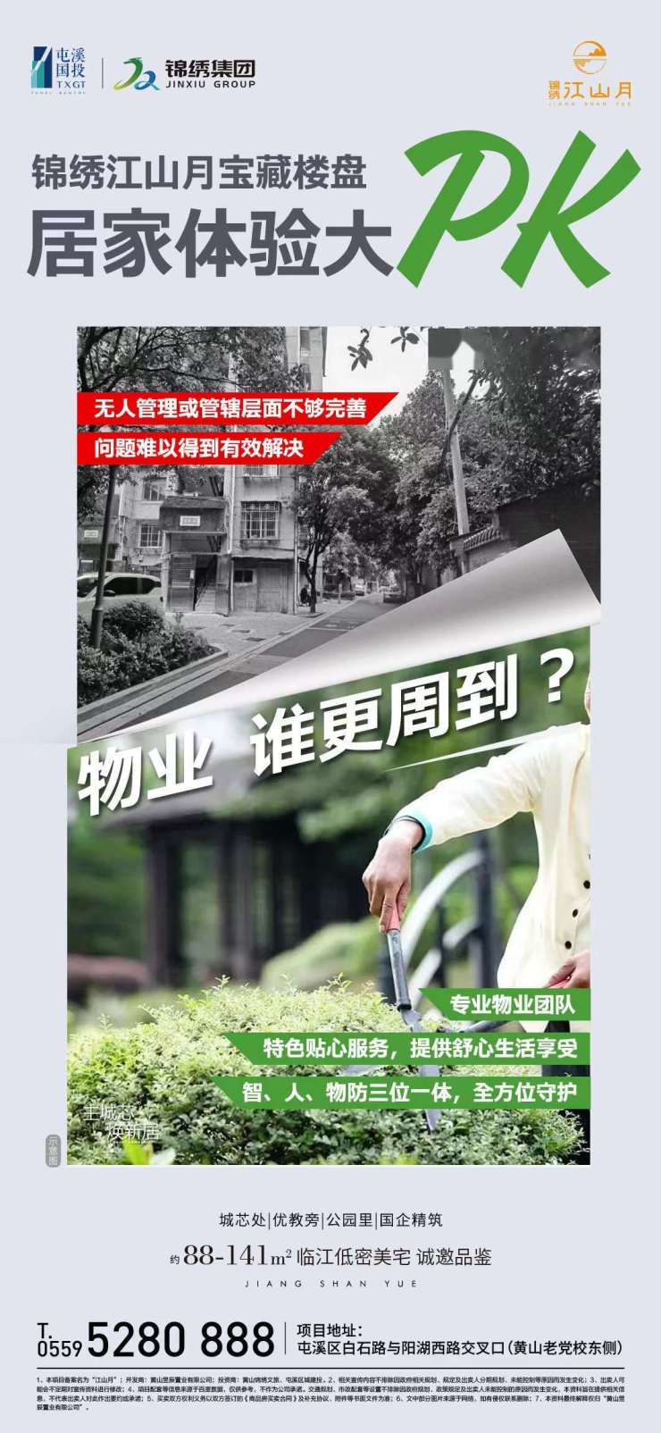 物业管理质量,一直是业主们最关心的问题。以前的老旧小区,由于没有专业的物业管理团队,小区内部整体环境就相对杂乱,而且很多问题都难得到解决,成为很多人的困扰。锦绣江山月,物业服务更周到。专业物业团队,特色贴心服务,提供舒心生活享受。智、人、物防三位一体,全方位守护。
