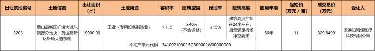 黄山高新区1宗工业用地成交,由安徽百诺佳医疗科技有限公司竞得
