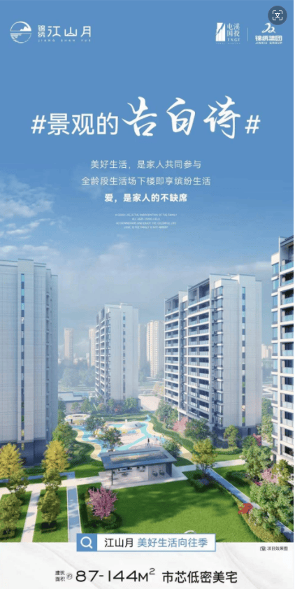 爱,是家人的不缺席,美好生活,是家人共同参与。锦绣江山月全龄段生活场,下楼即享缤纷生活。建面约87-144㎡市芯低密美宅热售中,均价12500元/㎡。