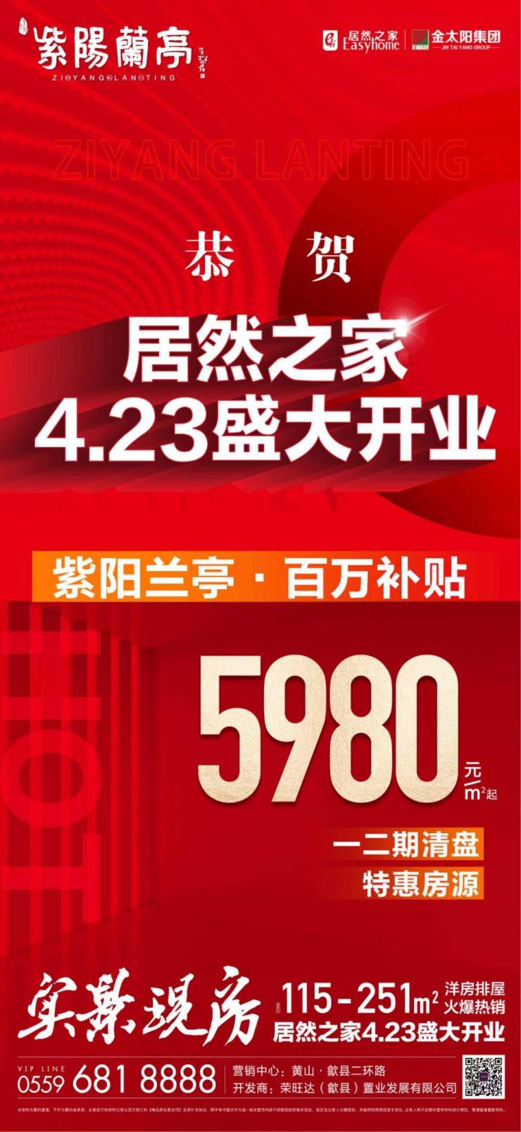 恭贺居然之家开业,紫阳兰亭,百万补贴,一二期特惠清盘房源,5980元/㎡起。