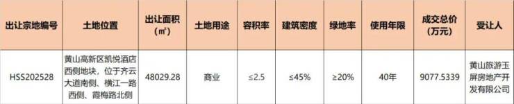 玉屏地产成功竞得黄山高新区凯悦酒店西侧地块商业用地,地块位于齐云大道南侧、横江一路西侧、霞梅路北侧,出让面积48029.28㎡,成交总价9077.5339万元,成交单价1890元/平方米(126万元/亩),容积率≤2.5。