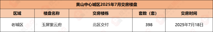 2025年7月,黄山中心城区玉屏紫云府北区交付,共计398套房源。