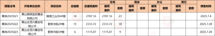 2025年7月,黄山中心城区锦绣江山月、紫荆书院2盘获预售证,新增可预售住宅房源50套,新增可预售住宅面积6235.95㎡。