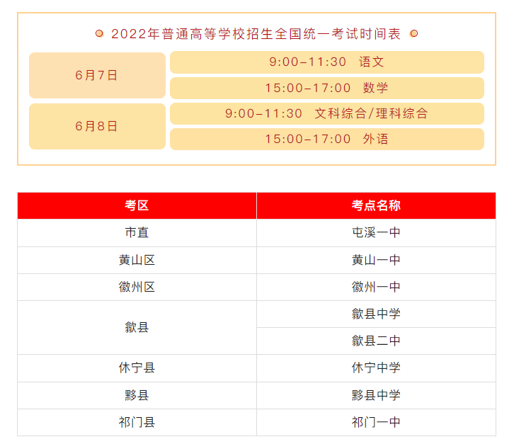 据了解,2022年,全市共有9539名考生报名参加高考,高职分类考试已提前录取1806人,将有7668 名考生参加6月7日至8日的高考。全市高考共设7个考区、8个考点、272个考场,市直考点为屯溪一中,黄山区考点为黄山一中,徽州区考点为徽州一中,歙县考点为歙县中学和歙县二中,休宁县考点为休宁中学,黟县考点为黟县中学,祁门县考点为祁门一中。
