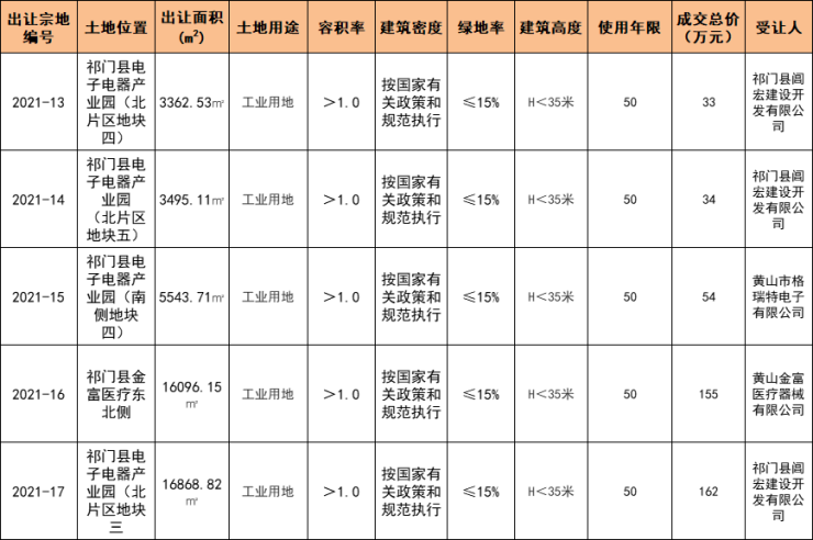 祁门县5宗工业用地成功出让,成交面积合计45366.32㎡