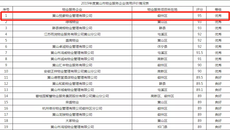 喜讯:2020年8月24日,市住建局在其官网发布“2019年度全市物业服务企业信用评价情况”,黄山纳尼亚小镇的黄山悦豪物业管理有限公司在162家物业脱颖而出,傲居榜首,当之无愧获此殊荣。