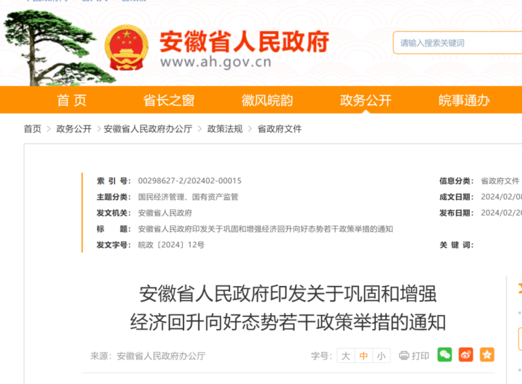 2月20日,安徽省人民政府网发布《关于巩固和增强经济回升向好态势若干政策举措》,出台八个方面共30条措施,着力解决当前企业生产经营中存在的痛点、难点、堵点,让政策“及时雨”更快更精准地惠及经营主体。