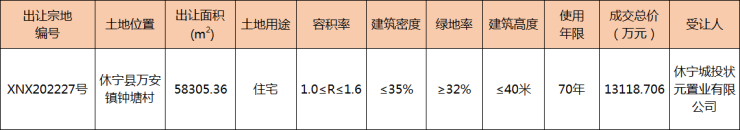 2022年12月12日,休宁城投状元置业有限公司底价竞得休宁县万安镇钟塘村(宗地编号:XNX202227)地块,成交总价13118.706万元,成交单价150万元/亩( 2250元/㎡),成交楼面价为1406.25元/㎡。