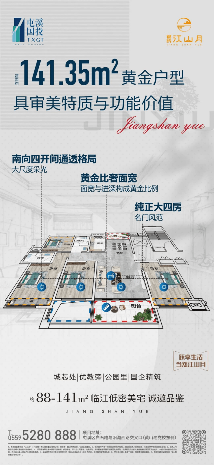 锦绣江山月141㎡黄金户型,纯正大四房,黄金比奢面宽,南向四开间通透格局,在家庭的不同阶段,无需换房,都能善待每一位家人。