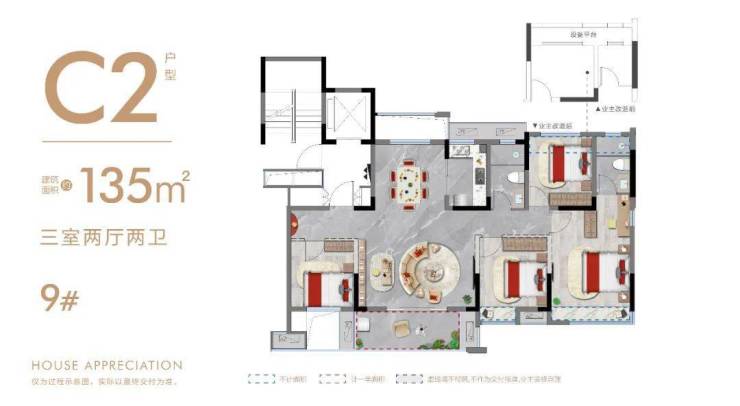 C2户型:一梯一户,四开间朝南,三重玄关,270°全明采光,悦享尊崇生活。