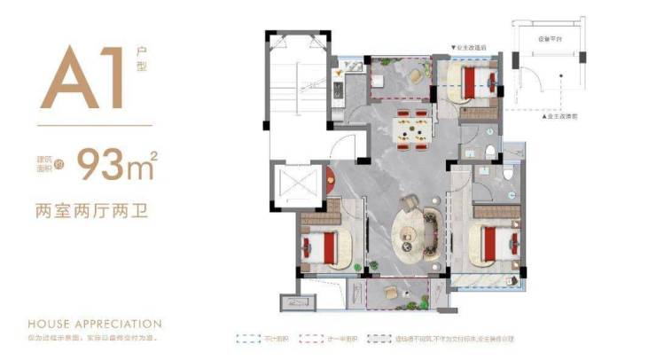 A1户型:大宽厅,三开间朝南,南北双阳台,独立玄关设计,更多收纳空间。