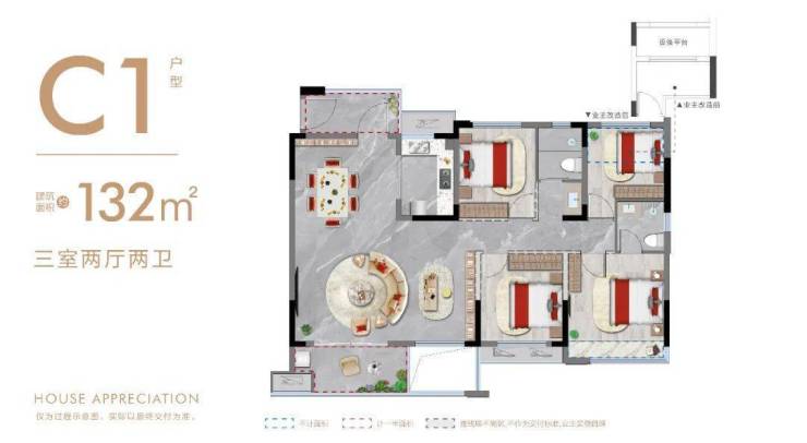 C1户型:私享入户花园,仪式感倍增,动静分区,6.8米奢阔大横厅,从容生活彰显。