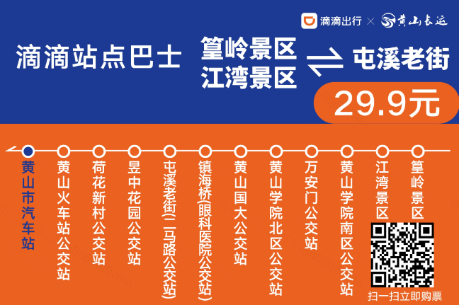 “篁岭景区⇌黄山市(屯溪老街)站点巴士”采用一票制,即全程任意站点上下客均为统一价格,运行期间票价:29.9元/人。