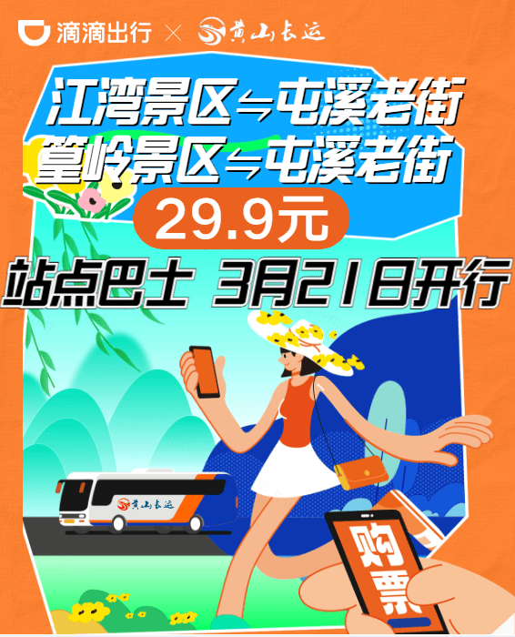 为满足群众多样化、灵活化、便捷化的出行需求,黄山首条旅游数字化客运定制班线——“ 篁岭景区⇌黄山市(屯溪老街)站点巴士 ”于3月18日起预售车票,3月21日开通试运行。