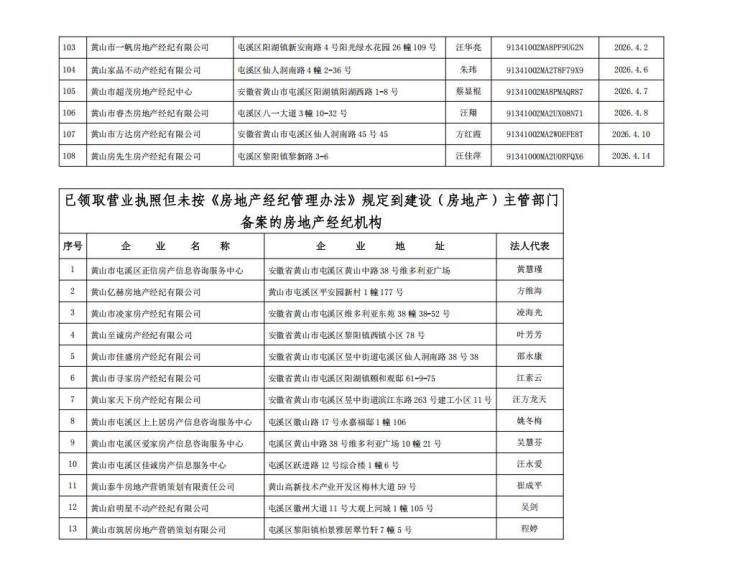 截至 2025 年 4 月 15 日,黄山市中心城区已备案并在有效期内的房地产经纪机构 108 家,未备案房地产经纪机构 24 家,现将具体情况公示如下: