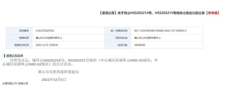 2022年12月5日,黄山市自然资源和规划局发布公告,三江口HSS202214号、HSS202215号地块终止出让。