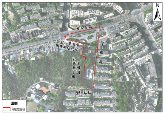 黄山市黄山区城区平湖东路千枫园西侧片区位于黄山市黄山区甘棠镇北部,东至千枫园,南至御景山庄,西至千枫园以西五十米、金宝二手汽车销售有限公司,北至平湖东路。涉及甘棠镇甘棠社区,片区总面积为1.2028公顷(18.04亩),其中建设用地1.0621公顷(15.93亩),农用地0.1407公顷(2.11亩),拟征收土地为1.0832公顷(16.25亩)。