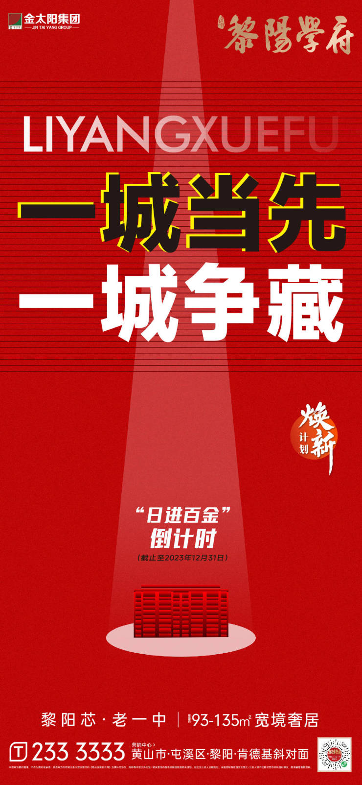 一城所向,压轴之作!1#、5#、11#、17#楼即将入市,居所难得,回归本源!黎阳学府焕新计划,日进百金”倒计时(截止至2023年12月31日)。