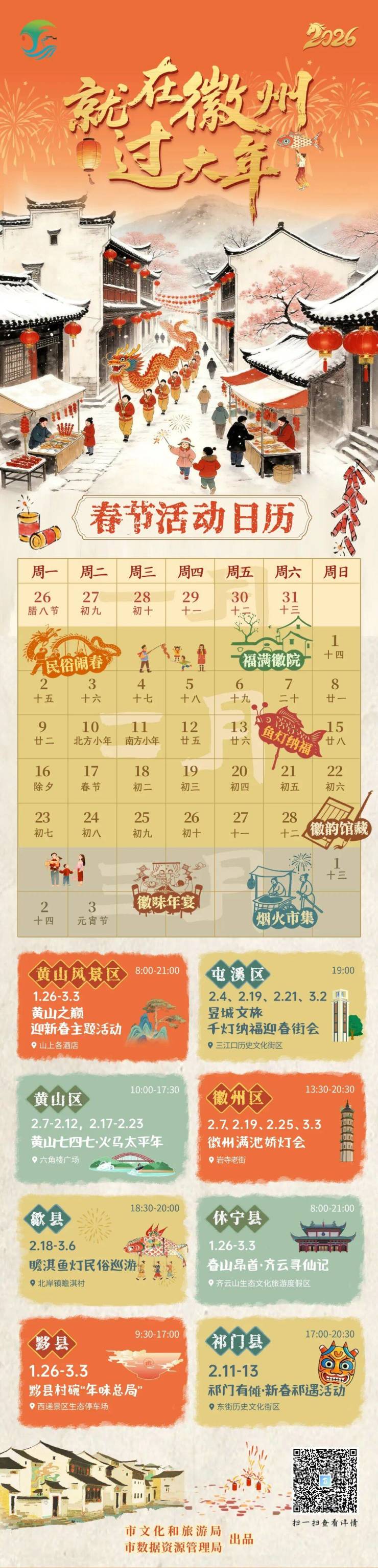 年味渐浓✨ 就在徽州过大年!逛烟火小巷尝地道徽味这份黄山春节活动日历请收好带你解锁宝藏黄山新年玩法扫码查看活动日历即日起至元宵节跟着这份活动日历解锁独属于徽州的新年浪漫把满满的年味和欢喜揣进兜里~来源丨黄山日…