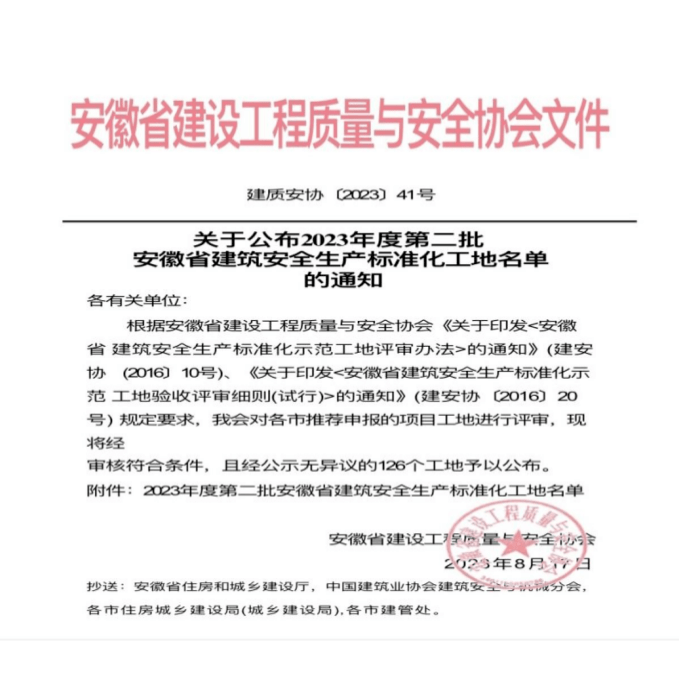 近日,安徽省建设工程质量与安全协会发布2023年度第二批安徽省建筑安全生产标准化工地名单,文澜轩项目获评“安徽省建筑安全生产标准化工地”。