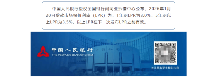 中国人民银行授权全国银行间同业拆借中心公布,2026年1月20日贷款市场报价利率(LPR)为:1年期LPR为3.0%,5年期以上LPR为3.5%。以上LPR在下一次发布LPR之前有效。