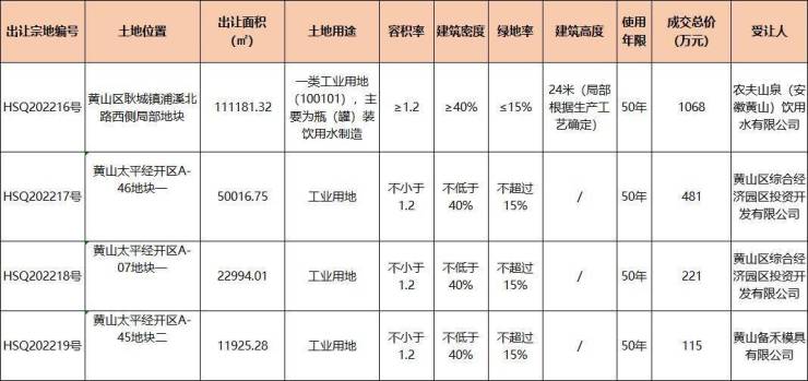 2022年11月10日,黄山区4宗工业类用地成功出让,其中3宗工业用地,1宗一类工业用地(100101),主要为瓶(罐)装饮用水制造。