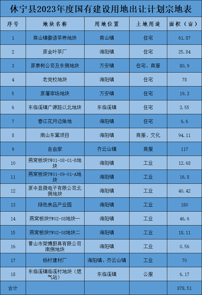 2023年5月6日,黄山市公共资源交易中心网站公布了休宁县2023年土地供应计划,供18宗土地,合计878.51亩。其中涉宅用地7宗,合计276.06亩,商服用地2宗,合计211.11亩,工业用地9宗,合计385.17亩,共服用地1宗,合计6.17亩。