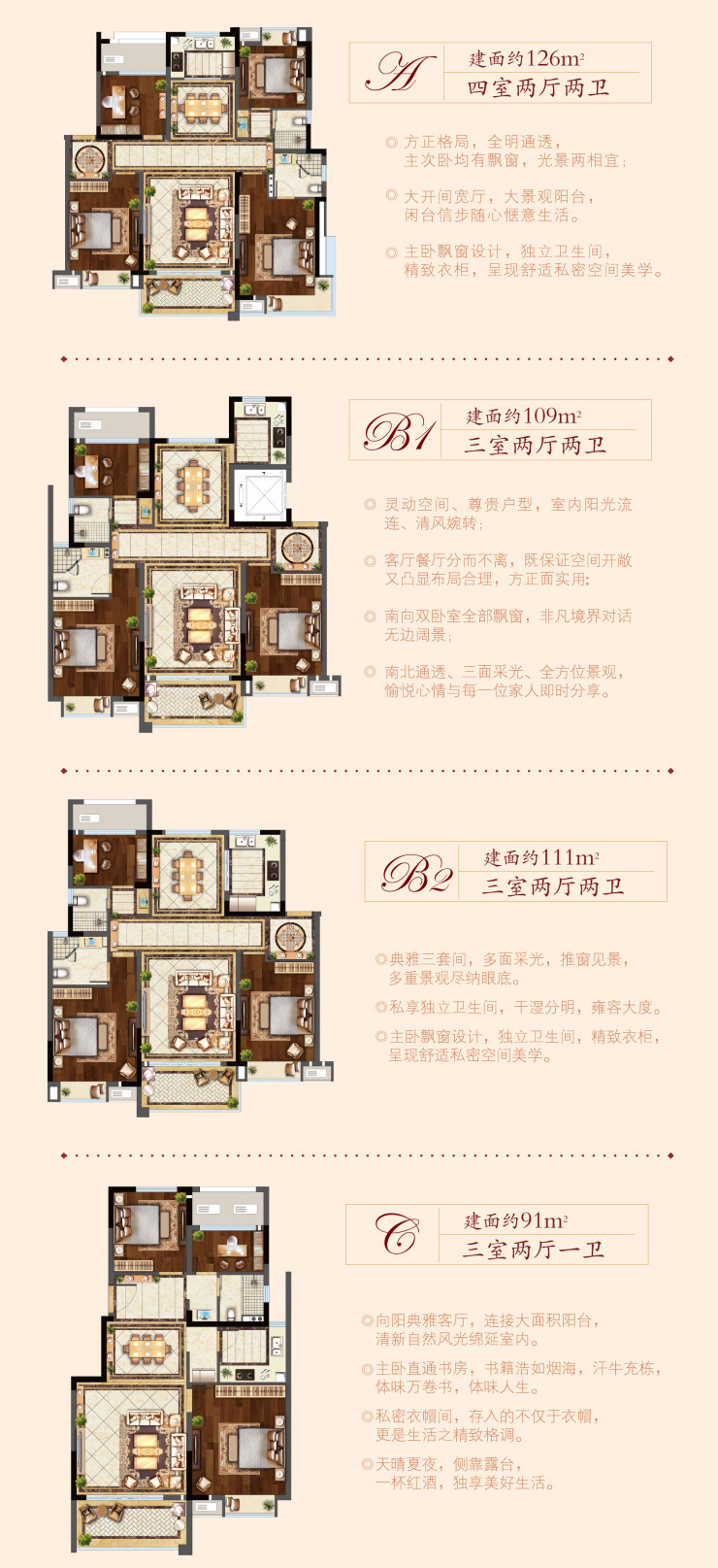 二期主打的户型为刚需三房和改善四房,均为市场热销户型。户型设计南北通透、格局方正、多室朝南,不仅公摊面积小、性价比高,还可以满足购房者多重购房需求。