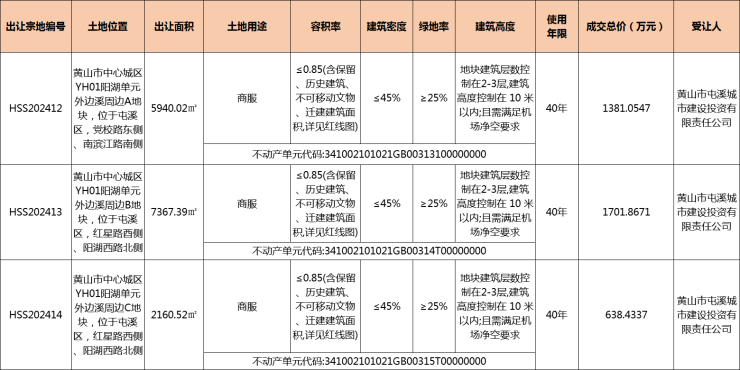 2024年11月8日,黄山中心城区 YH01阳湖单元外边溪周边A、B、C3宗地块成功出让,由黄山市屯溪城市建设投资有限责任公司以总价3721.3555万元竞得。