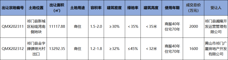 2023年7月21日,祁门县新城区裕珑湾南侧地块(宗地编号:QMX202311)、祁门县金字牌镇继光村出口地块(宗地编号:QMX202312)2宗商住用地底价成交。其中,祁门县阊隆开发运营管理有限公司底价竞得祁门县新城区裕珑湾南侧地块,成交总价2000万元,成交楼面地价899.45元/㎡;黄山市祁门广厦房地产开发有限公司底价竞得祁门县金字牌镇继光村出口地块,成交总价1600万元,成交楼面地价668.72元/㎡。