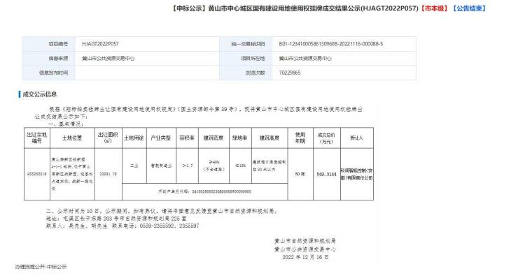 黄山中心城区1宗工业用地成功出让