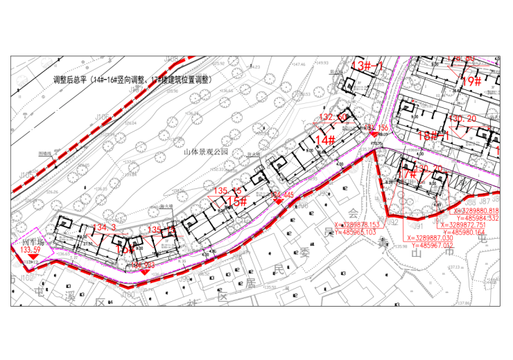 溪山亭苑项目位于花山路东侧,建设单位为黄山新徽投资有限公司,项目规划设计方案于2023年7月批复,目前项目正在实施建设。现建设单位根据场地实际环境,申请对项目14#-17#楼规划设计方案局部调整,具体为:(1)对14#-16#楼±0.00标高调整,同时对建筑南侧道路标高同步调整;(2)对17#楼建筑定位微调,整体向北侧移动约0.55米。经审查方案局部调整后均满足相关规范要求,根据有关规定,现将调整前后局部总平面图纸予以公示,如有意见和建议,请在公示期内向我局反馈。