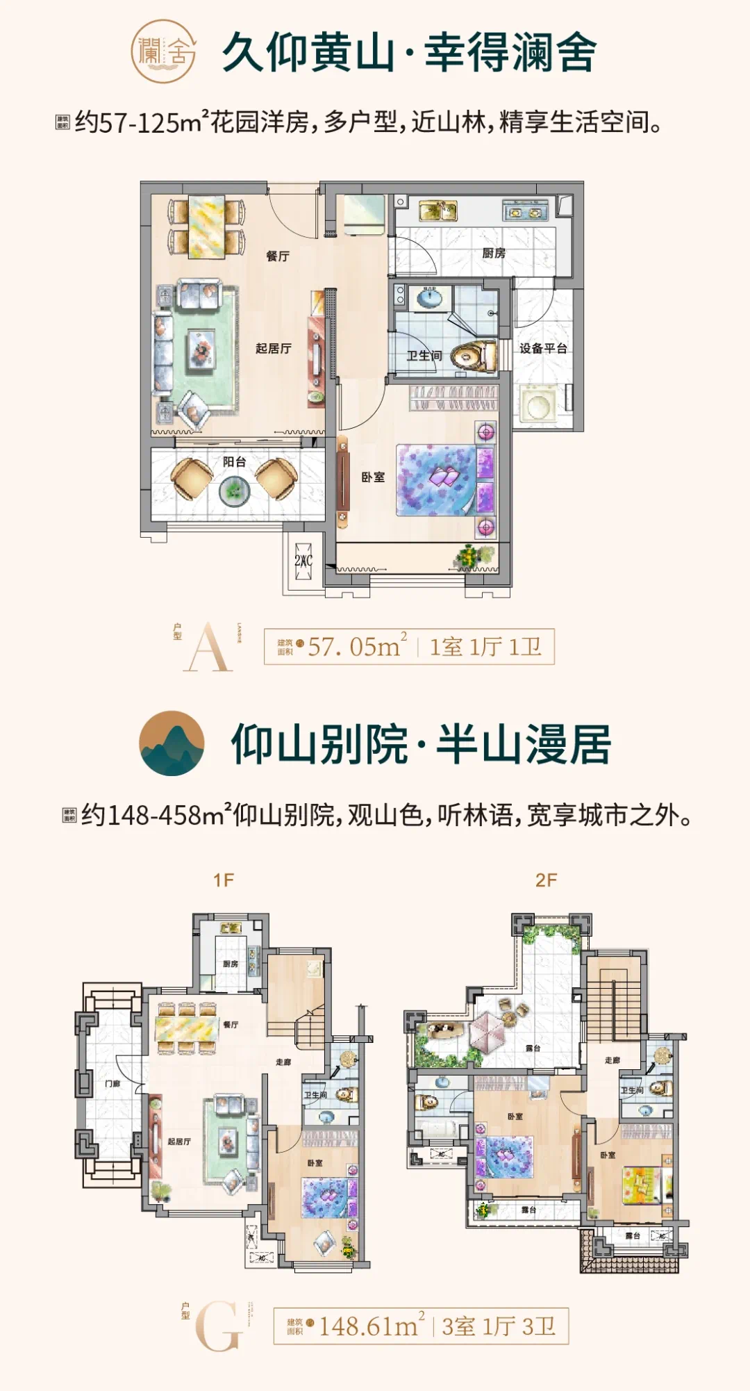 建筑面积约148-458㎡双拼/独栋,送约1:1超大庭院,首付58万起;建筑面积约57-125㎡70年产权精妆平墅,拎包入住,首付18万起。