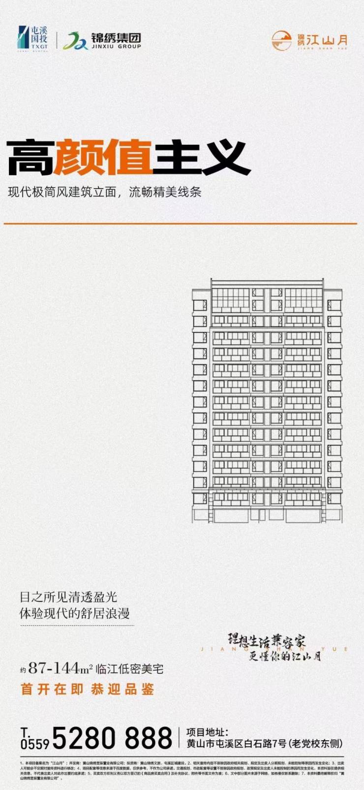 锦绣江山月,高颜值主义,现代极简风立面,化繁为简,摒弃冗余,减少琐碎,以现代简约的建筑语言,解读城市生活的当代样本。