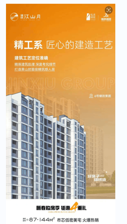 精工系,匠心的建造工艺。锦绣江山月建筑工艺定位准确,精琢建筑肌理,深度考究细节,打造黄山封面级精筑感人居。锦绣江山月建面约87-144㎡市芯低密美宅热售中,均价12500元/㎡。暖春购房,钜惠四重好礼:来访礼,来访送好礼;认购礼,暖春认购优惠放肆享;签约礼 ,按时签约即享砸金蛋赢家电;安家礼,春日特惠房源限时抢。