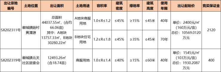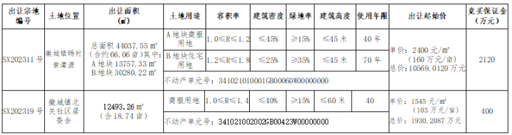 2023年5月22日,徽城镇旸村黄潭源1宗商住用地(宗地编号:SX202311号)、徽城镇北关社区居委会1宗商服用地(宗地编号:SX202319号)挂牌出让。