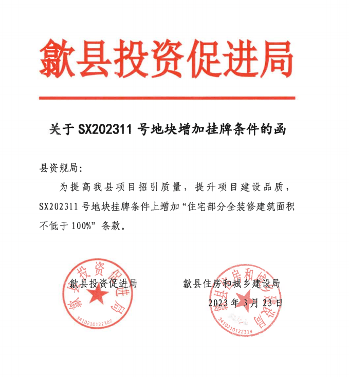 歙县1宗66.06亩商住用地挂牌,要求住宅部分全装修建筑面积不低于100%!