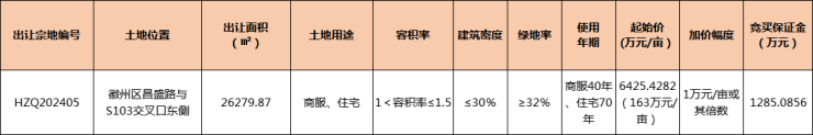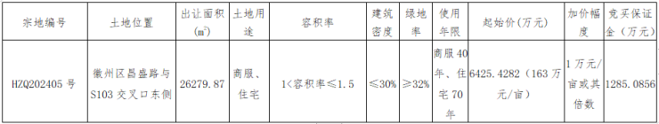 2024年7月24日, 徽州区宗地编号HZQ202405号商住用地挂牌,宗地位于徽州区昌盛路与 S103 交叉口东侧,出让总面积:26279.87 ㎡(合 39.4198 亩),容积率>1,≤1.5,起始总价:6425.4282 万元,起拍单价:2445元/㎡(163万元/亩),起拍楼面地价:1630元/㎡,拍卖时间:2024年8月24日15时30分。