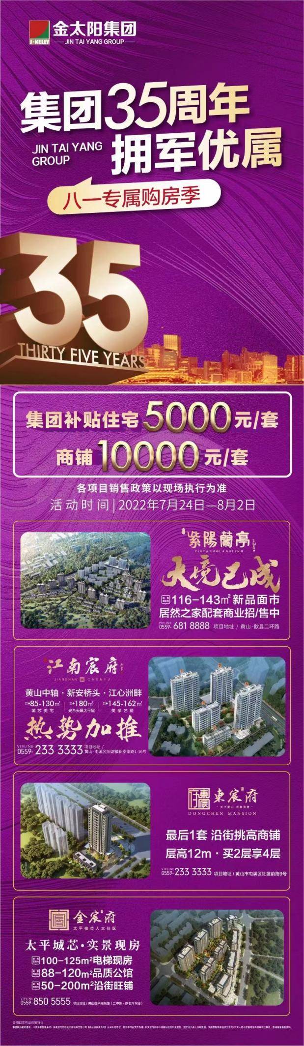 紫阳兰亭,歙县红盘,实力领跑!现建面约116-143㎡新品面市,居然之家配套商业全城火爆招/售中。金太阳集团35周年,拥军优属,八一专属购房季活动正在进行中,四盘联动!住宅集团补贴5000元/套,商铺10000元/套。活动时间:2022年7月24日-8月2日,钜惠时刻,不容错过。