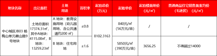 其中,A地块为教育用地,出让面积4115.08㎡(6.17亩),出让单价840元/㎡(56万元/亩),固定不变,不参与竞价;B地块为住宅用地,出让面积13259.23㎡(19.89亩),容积率≤1.6,起始单价5850元/㎡(390万元/亩),对比首次挂牌时的6330元/㎡(422万元/亩),起始单价下降480元/㎡(32万元/亩);楼面地价3656.25元/㎡,对比首次挂牌时的3956.25元/㎡,起始楼面地价下调300元/㎡。普通商品住宅的销售备案均价不得超过 14000 元/㎡(毛坯房)。