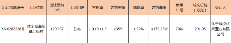 2022年12月14日,休宁城投状元置业底价竞得休宁县海阳镇北街村XNX202228号地块,成交总价291.05万元, 成交单价150.33万元/亩(2255元/㎡),成交楼面地价1734.62元/㎡。